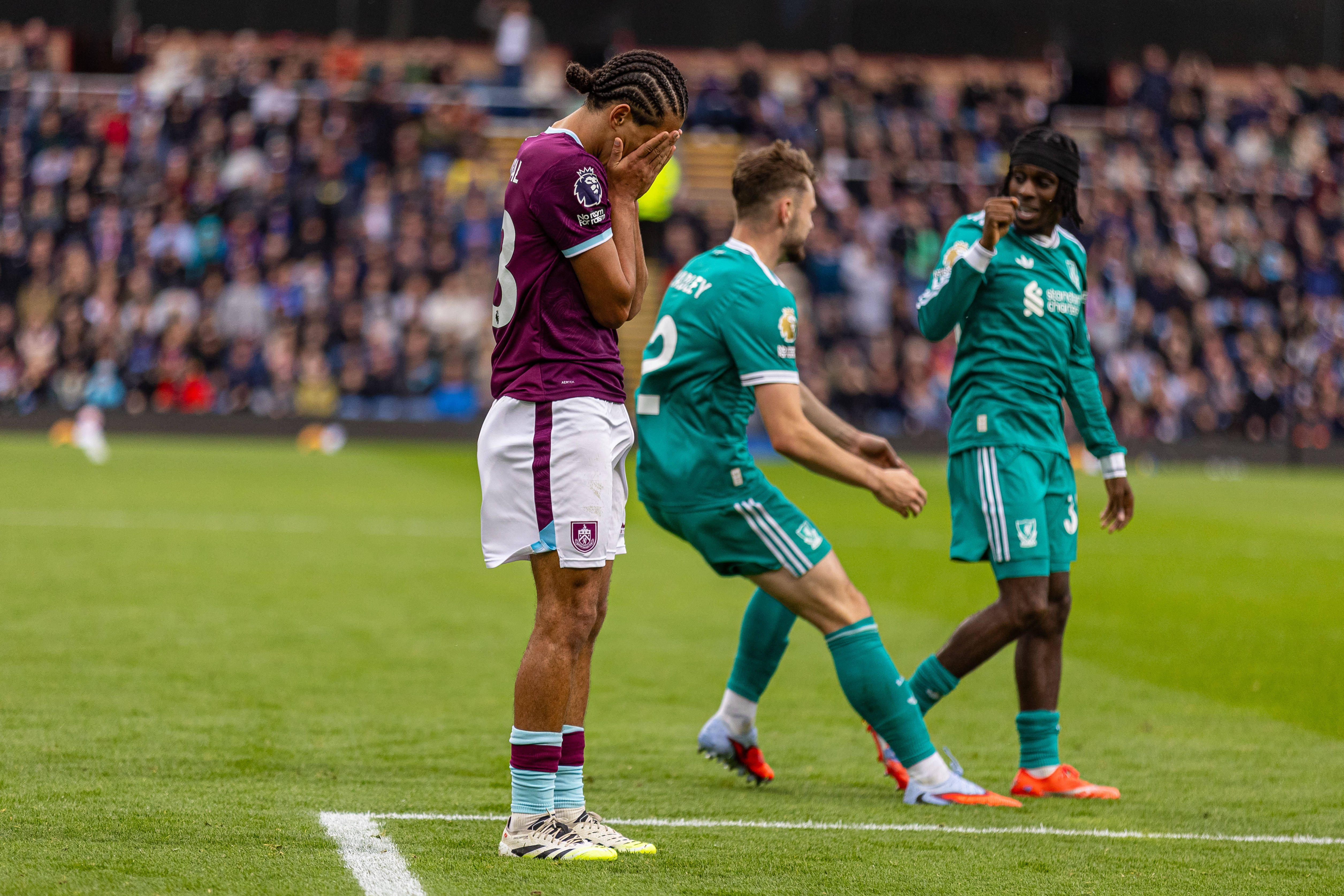 9月14日,伯恩利队球员汉尼拔(左)在利物浦队获得点球机会后神色沮丧。 虎扑体育发