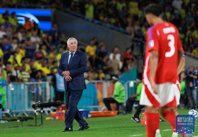 ↑ 巴西队主教练安切洛蒂(左)在场边观赛。
