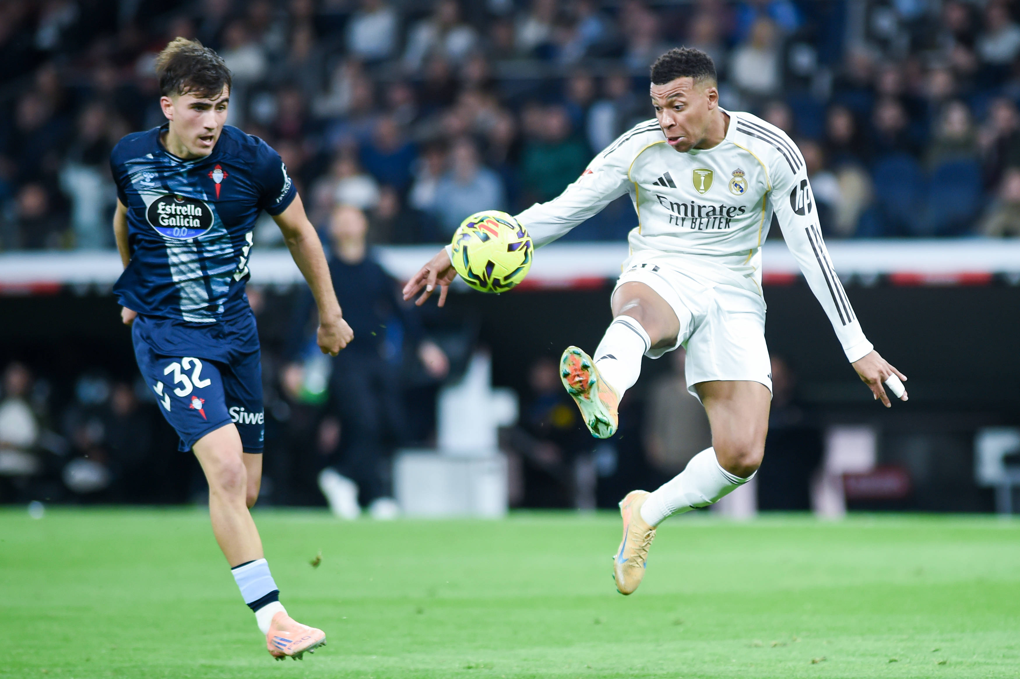 12月7日,皇家马德里队球员姆巴佩(右)和塞尔塔球员哈维·罗德里格斯争抢。 虎扑体育发(古斯塔沃·巴连特摄)