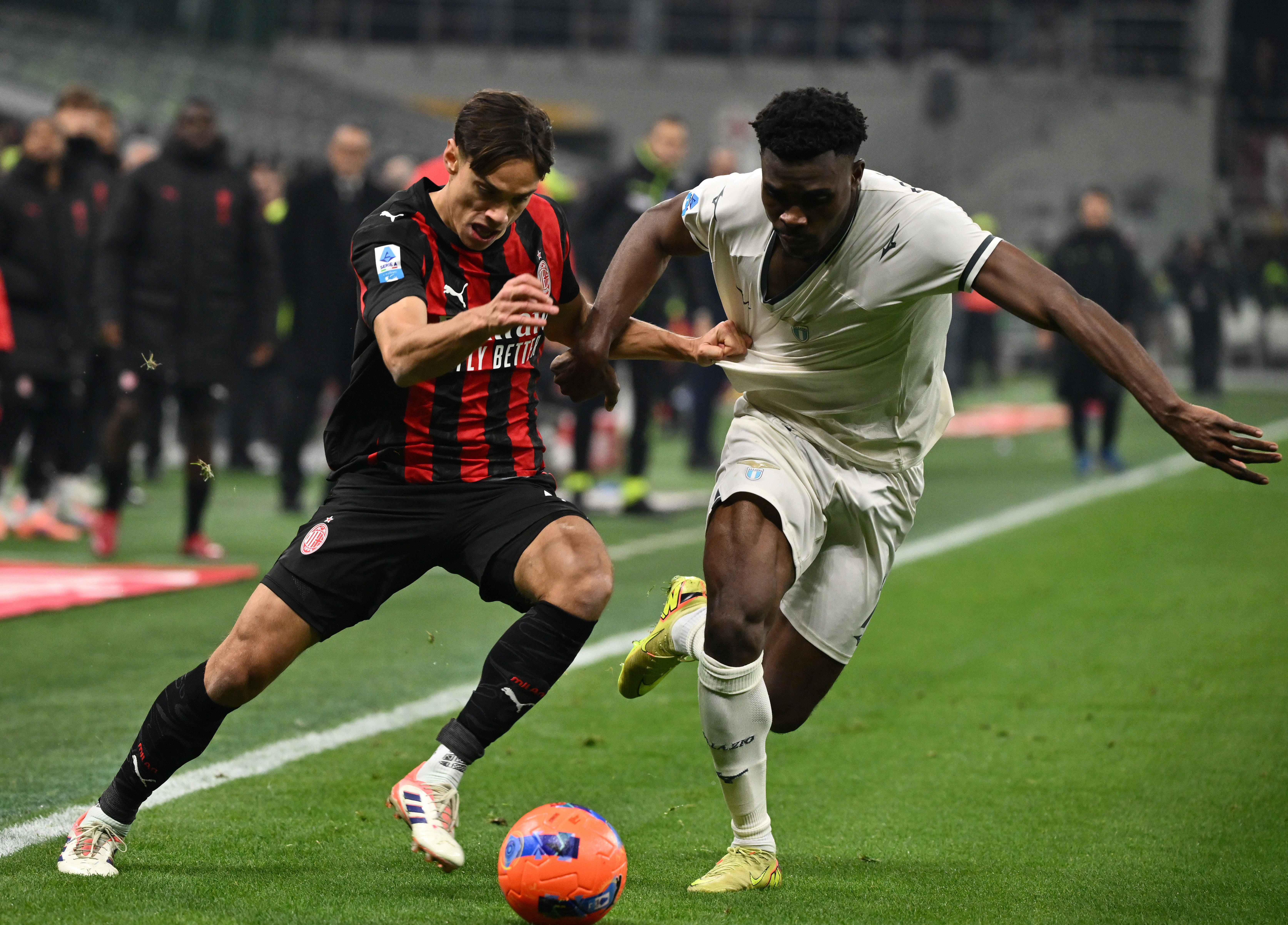 11月29日,AC米兰队球员里奇(左)与拉齐奥队球员巴希鲁在比赛中拼抢。虎扑体育发(阿尔贝托·林格利亚摄)